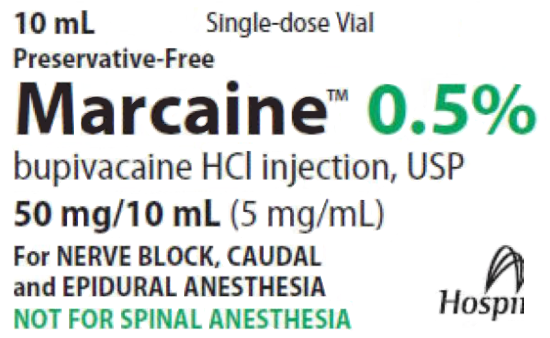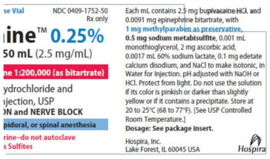 Otra cosa diferente es con la bupivacaína del laboratorio estadounidense Hospira (Marcaine), en donde en algunas presentaciones de su Marcaina sí se añaden parabenos y sulfitos. A pesar de esto no hay reportes comprobados de lesión neurológica por su aplicación. Concentraciones elevadas de lidocaína 5% (lidocaína hiperbárica) y bupivacaína 0.75% sí han generado síntomas neurológicos transitorios, pero esto es otra historia diferente.