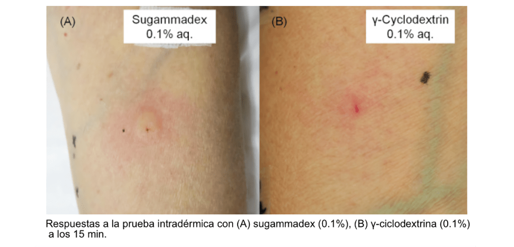 1. Allergy to low dose sugammadex. L Menéndez-Ozcoidi. Anaesthesia. 2011 Mar;66(3):217-9. Describimos el caso de un hombre de 17 años que desarrolló una reacción alérgica grave a una dosis clínica baja de sugammadex (3.2 mg/kg, 200 mg IV), 1 min después de su administración. Se manifestó por un intenso eritema en la parte anterior del tórax, edema labial y palpebral severo y sibilancias bilaterales. En una investigación posterior, el paciente tuvo una prueba de punción cutánea positiva para sugammadex (respuesta 5 mm, con un control de solución salina negativa y un control de histamina positivo de 5 mm) y ninguna respuesta a ningún otro fármaco probado. Otras pruebas de diagnóstico respaldaron un diagnóstico de reacción alérgica al sugammadex.